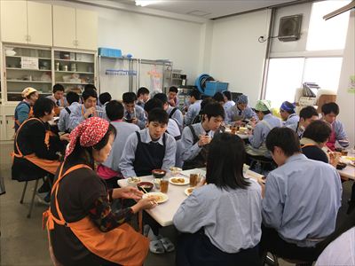 今年で13年目となる郷土料理講習会は、家庭科の授業の一環として3年生全クラスを対象に行っています。生徒たちは講師の「くまもとふるさと食の名人」の方々に指導していただきながら、『山菜おこわ』『つぼん汁』『切干大根の酢の物』『ねったんぼ』の4品を完成させました。名人の方々や先生方とも一緒に会食し、たいへんにぎやかで心も体も温まる時間を過ごしました。