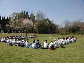 昨日、村山公園にて交歓会が行われました。前日まで雨が降っていたため心配されましたが、当日は晴天で晴れやかな天候の中、出発式がハンドボールコートで行われ、村山公園へ出発しました。交歓会では、各科の職員紹介がありました。その後、生徒たちの自己紹介があり、それぞれ工夫を凝らした紹介をしていました。1年生も、先輩たちとの交流を深めることができたと思います。