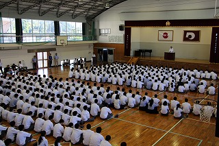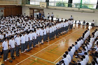 平成29年度の県高校総体激励式が体育館にて開催されました。校長先生より「戦う集団の勝敗を左右する3要素として「練度」、「士気」、「装備」だと言われていますと、3要素について話をされました。サッカーとカヌーが明日から、ソフトテニスが明後日から競技が始まります。留守番部隊の生徒と一緒になって精一杯応援しますが、試合の結果はデジタルです。勝つか負けるか必ずあります。勝っても慎みを忘れず、負けてもプライドを持って胸を張って相手の勝利を讃えてください」と、激励の話をされ、選手宣誓でバレー部主将より、「球磨工生としての誇りを持ち、精一杯頑張ります」と、堂々とした選手宣誓でした。来月2日からは全種目競技開始されます。みんなインターハイ目指して頑張ってもらいたいと思います。