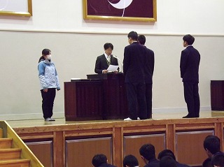 美化コンクール表彰式後、生徒会執行部の任命式及び交代式が行われました。生徒会執行部の任命式では『新生徒会長:2年建築科_橋本くん』、『新副会長:2年電気科_鳥越さん』、『新副会長:1年機械科B組_玉村くん』より、「精一杯頑張りますのでよろしくお願いします」とあいさつがありました。交代式では、旧生徒会長の常松君より、「1年間、本当にお世話になりました。皆さんの協力のおかげで無事1年間執行部としての仕事を全うすることができました」とあいさつがありました。新執行部となり、大変なこともこれからたくさんあると思いますが、球磨工業活性化のために頑張って欲しいと思います。