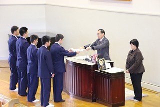 表彰式のあと終業式があり、西校長先生のお話の中で、3つのことについて話をされました。ます一つ目は、進路実現についてです。「3年生の就職決定が12月上旬には早々と決まってしまい、残すは進学のみとなりました。1・2年生も自身の進路実現に向けて早い段階から目標を持って取り組んでください」と話されました。二つ目は、部活動です。「多くの部活動の活躍が見られました。来年度も【挑戦】のスローガンの元頑張って欲しいと思います」と言われ、本校の生徒たちに対する期待の大きさがわかりました。三つ目は、工業教育についてです。「3年生の皆さんが1年生の時、2年生の時、3年生の時とそれぞれ大きな事件がありました。燃費のデータ改ざんや、鉄鋼会社の鉄の品質のデータ改ざんや、無資格者による車の検査など大きな事件がありました。日本の産業の基盤を揺るがすものでした」と言われ、「多くの経験を積み日本のものづくりの技術を引き継いでいって欲しい」と言われました。もうすく卒業する3年生には、球磨工業高校で学んだ事を活かしそれぞれの場所で活躍して欲しいと思います。皆さん、良いお年をお迎えください。3学期元気に会いたいと思います。長い2学期でしたがありがとうございました。