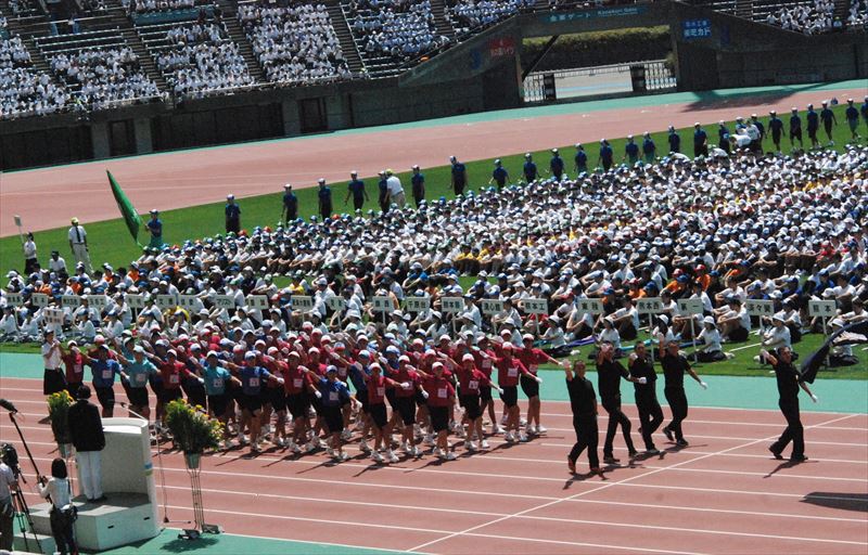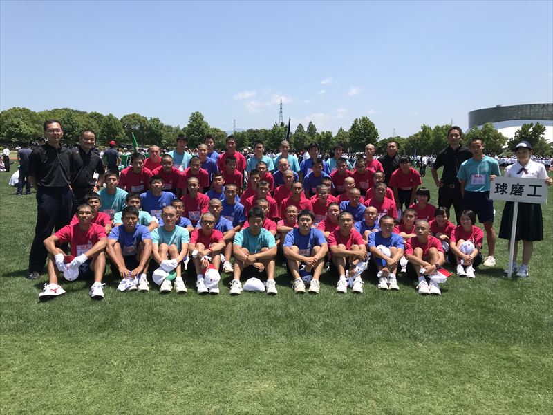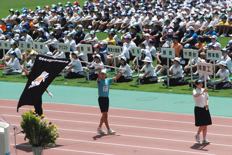 6月1日、第46回熊本県高校総合体育大会の総合開会式が午前10時から熊本市えがお健康スタジアムで行われました。入場行進では、熊本商業高校3年生の佐藤彩香さんにプラカードを持っていただきました。本校からは団長の西校長先生をはじめ、旗手3MA鶴田舞杜、陸上競技部、ソフトテニス部の合計57名で参加してきました。行進の練習は3日間ととても短くはありましたが、全員で一致団結することができ、見事昨年度に引き続き奨励賞校に選ばれました。多くのご声援ありがとうございました。