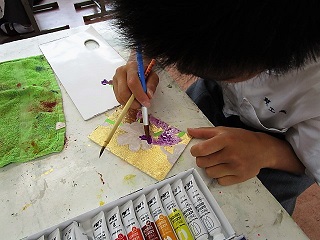 「画用紙ボードに金箔を貼り、その上に花を描く」