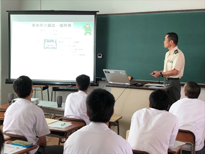 7月5日(木)、本校に自衛隊熊本地方協力本部人吉地域事務所の方々をお招きし自衛官採用についての説明会を行いました。公務員志望の1~3年生の男女18名が参加し、説明を受けました。会の中では、熊本地震の際に活躍された自衛隊の方々の映像が流れ、生徒たちは真剣なまなざしで説明を受けていました。