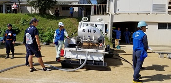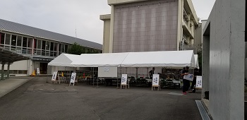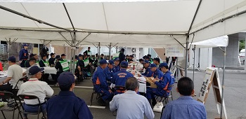 10時55分には、防災ヘリが本校グラウンドに着陸し、防災ヘリの説明を受けた後、展示があり11時10分に飛び立ちました。11時15分からは、婦人会による非常食の炊き出し(カレーライス)があり、参加者約130名にふるまわれました。