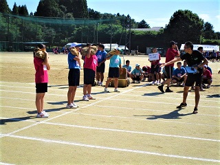 (俵担ぎリレーの確認中。本番では力強く走り抜きますよ!)