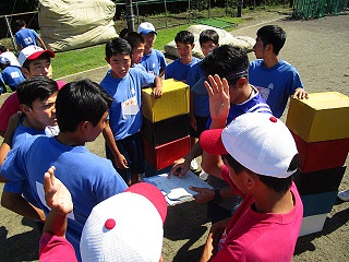 (用具係。用具を運ぶ前の打ち合わせ。真剣に話し合います。)