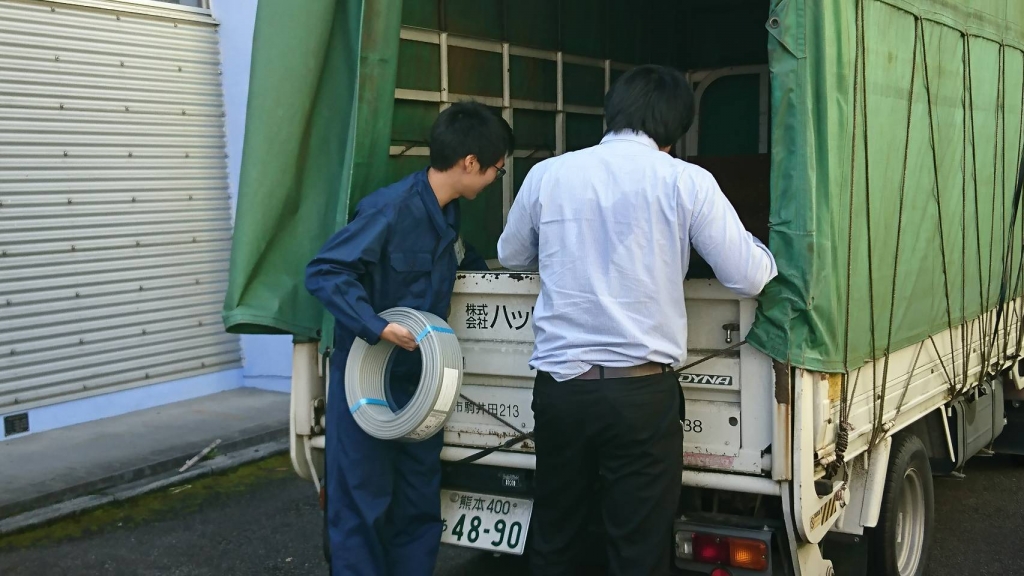 ケーブルをトラックに積み込んでいます(ハッピー電気商会 様:人吉市)