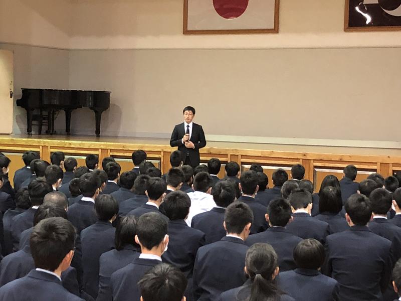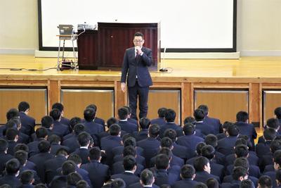 そこで、3学期第一回目の学年集会では、本校OBの中村隆史さん(人吉第二中学校卒)をお呼びして「社会人になって感じたこと」「高校生のうちに考えておいて欲しいこと」などをテーマにお話をしていただきました。