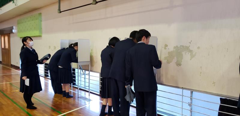 ユーモア溢れる先生方の熱い公約演説に笑顔で耳を傾けながらも、投票の際には真剣な表情で記載台に向かう生徒たちの表情がとても印象的でした。