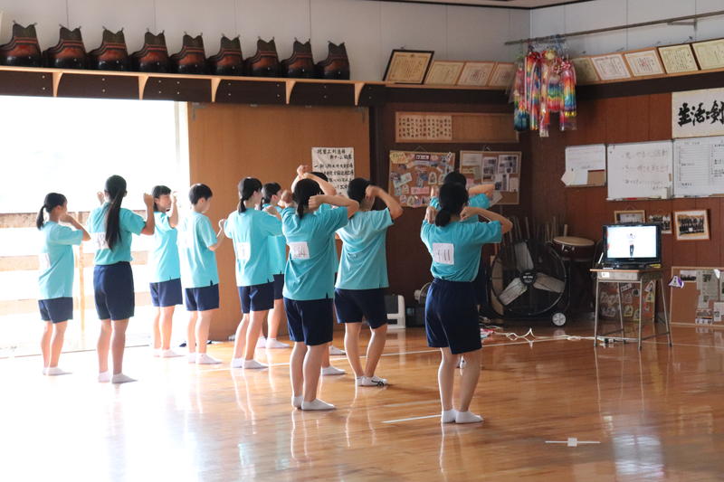 女子は武道場でダンスの振り付けを覚えているところです