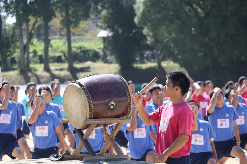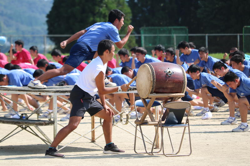 太鼓を任されて緊張気味です。生徒の動きを見ながら太鼓をたたきます。
