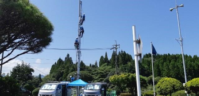 昨日からアンテナの取付をしているようです。今日は大変暑い中、電柱に3人の作業員が登って、難しそうな配線作業をしていました。