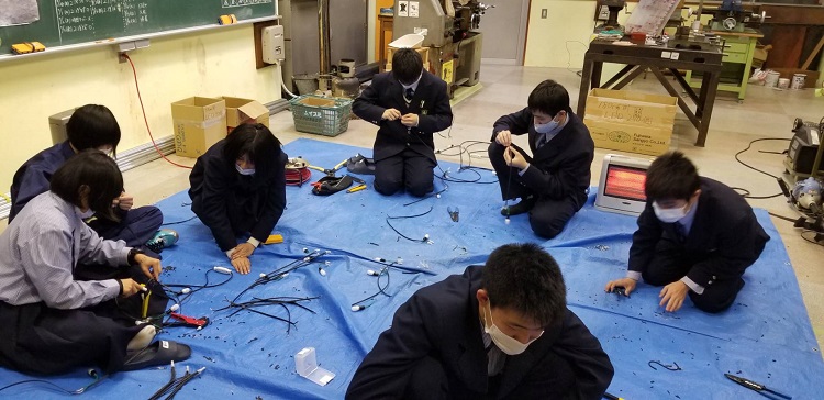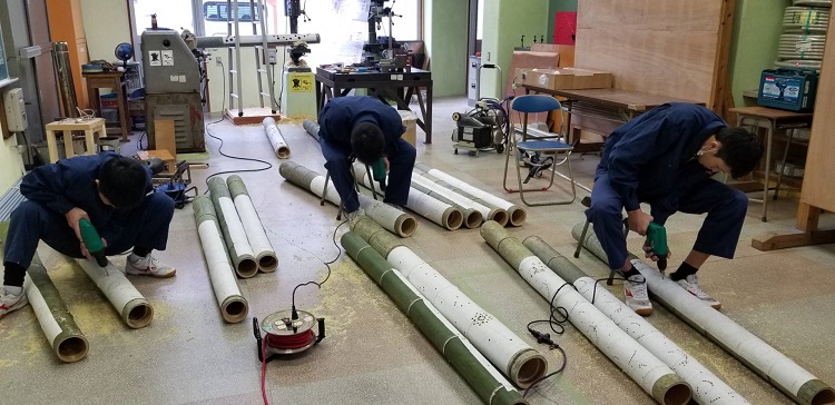 今年は、2月11日(木)に設置を行います。その準備のために、12月から、電飾の製作、竹の穴開けのボランティア活動をしてきました。例年は電気科の生徒が中心でしたが、今年は写真部の生徒や電気工作部の生徒など、『有志』によるボランティア活動を行っています。
