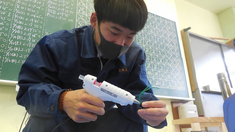 本校では、第2種電気工事士や第1種電気工事士に多数の生徒が合格しており、その技術を生かした竹灯籠の中に入れる『電飾』の製作や設置による電気配線を行ってきました。