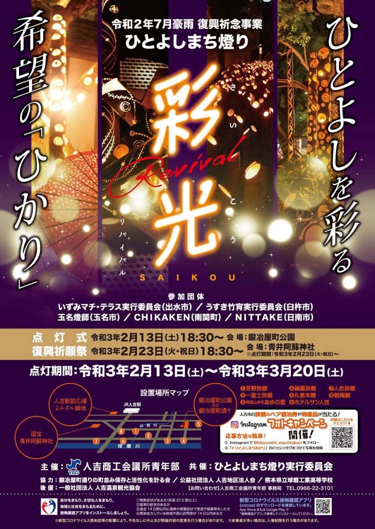 今年は、2月13日(土)~3月20日(土)18:30~、7月豪雨復興祈念行事として、いずみマチ・テラス実行委員会(出水市)、うすき竹宵実行委員会(臼杵市)、玉名燈師(玉名市)、CHIKAKEN(南関町)、NITTAKE(日南市)の協力を受け、鍛冶屋町だけでなく、JR人吉駅前、青井阿蘇神社の3カ所に、竹灯籠の燈りをともします。