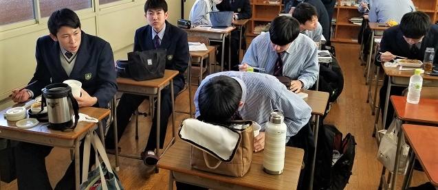 3年生は明日から学年末考査が始まりますので、本日1月25日(月)は3年生にとって、「高校生活最後の弁当!」の日となり、電気科3年生の教室へ行ってみました。