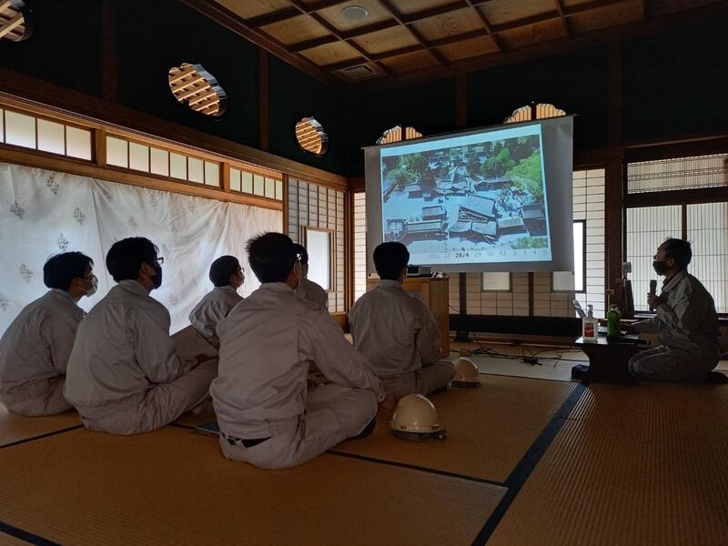 楼門の現場見学後、伝統建築専攻科の生徒は、「阿蘇神社の災害復旧事業」について復旧工事の設計監理を担当されている文化財建造物保存技術協会の方にお話をしていただきました。