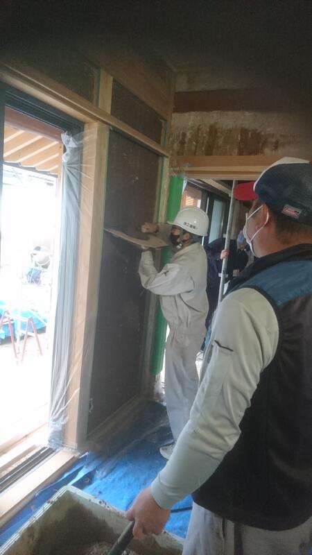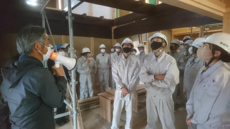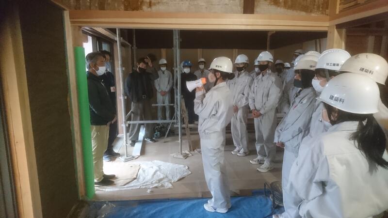 「くまもと型伝統構法」の住宅見学では、実際に施工中の住宅現場を見学しました。構法の特徴や作業内容などの説明を受けた。生徒たちは土壁の中塗り体験や田口社長に対して古材の活用に関する発問をするなど、積極的に学習に取り組みました。