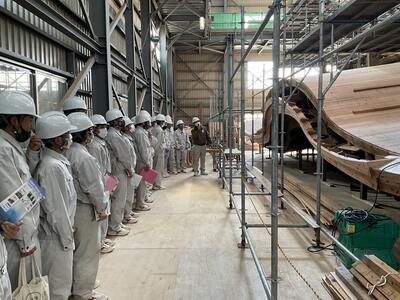 田口技建様の工場に伺い、「くまもと型伝統構法」とは何か、またそれらに用いる継ぎ手、仕口、土壁の説明を受けました。継ぎ手、仕口については学校で学習した内容が含まれており、授業と現場を繋げて理解できている様子でした。