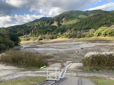 その市房ダムも水量が少なくなっており、陸地から艇を出す場所が遠くなっています。