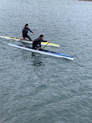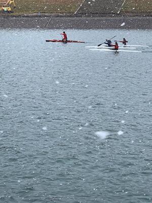 週末はとても冷え込む予報は出ていましたが、想像以上の寒さでした。17日(土)は雨が降っており、18日(日)は雪と、水上で練習する部員の体をさらに冷やす天候でした。18日(日)は伊佐市に行く道中も、辺り一面雪景色でした