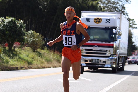 今年の高校駅伝は体感温度が高く、風の強い中での開催となりました。各校のエースが集う1区は、昨年同様、鶴田舞杜(多良木中)を起用しました。伝統校が積極的なレースを展開する中、第2集団で冷静な状況判断をし、勝負の後半で前を行く選手をかわしていきました。これまで歯がゆい思いばかり経験し、それでも前を見据え続けたエースは7位で襷をつないでくれました。2区は球磨工業イチのスピードを持つ椎葉勇斗(相良中)。1年次から腰の故障で思い通りの練習ができませんでしたが、地道に歩み続けました。入りの1kmから積極的に突っ込み、前を行く選手を懸命に追いかけました。1つ順位を上げ、昨年の自己記録を10秒更新する快足を見せ、6位で襷をつなぎました。続く3区は上原健太郎(相良中)に託しました。2年生から入部し、多くを語らずコツコツと努力を続けてきました。後半の2kmで必死に粘り、ライバル校に先行を許したものの、前が見える位置で4区の岩川智也(あさぎり中)につなぎました。上原は今回の悔しさを上の舞台で晴らしてくれることでしょう。岩川は1年次から故障に泣き、ようやく走り始めたのが今夏。高校初のレースが大舞台の高校駅伝。2年生エースとして、3年生がつないだ襷をつけ、前半から突っ込み前を追いました。レース後は重圧からの急性胃炎で病院へ搬送されました。レース当日は体調不良を隠し、プレッシャーと戦い続けました。5区佐々木渉(山江中)は、1年生エースとして初めての高校駅伝を駆け抜けました。向かい風の2kmを冷静に走り、折り返しのラスト1kmの上りを必死にこらえ、区間5位と力走してくれました。これから更にエースとしての自覚を芽生えさせ、飛躍してくれることでしょう。6区は椎葉港翔(人吉二中)を起用し、初の高校駅伝のプレッシャーの中、前を行くチームを追いました。7区の繰り上げスタートの時刻が迫る中、必死の形相で走り続け、5位との58秒差を26秒差まで縮める走りを見せましたが襷はつながりませんでした。この悔しさを必ず晴らしてくれるでしょう。7区は主将の山崎隼汰(湯前中)。大会直前まで調子が上がらず、起用も危ぶまれましたが、主将のプライドと負けん気の強さで大会を迎えました。繰り上げの悔しさをパワーに替え、スタジアムまで駆け上がりました。ゴール後も着順がわからず、緊張の中、結果を待ちました。結果は5位と見事逆転。これで5年連続の入賞となり、球磨工業歴代タイ順位の結果を残せました。しかし、強豪校との差も、まざまざと見せつけられた結果となりました。上位校への挑戦へ向け、選手たちも想いを新たにしました。