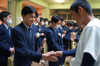 記念品を在校生から渡しました。これまで、一緒にプレーしたチームメイト、