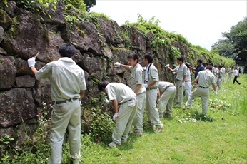 史跡である人吉城の石垣の除草・除苔作業には、鎌のような鉄製のものは使うことができません。