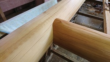 八代市内に設置する予定の鳥居の製作を行っています。桧の丸太の皮を剥いで鳥居の材料としてそのまま使います。その為、部材と部材の接合部は「光付け」という作業によって、互いの形に合せて綺麗に加工していきます。加工して、合せて、加工して・・・という作業を繰り返す必要があり、非常にコツのいる作業です。