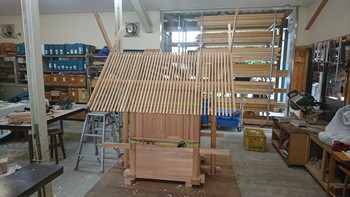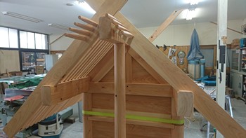 八代市に設置予定の神明造の祠は桁や垂木、鞭懸などが取り付けられ野地、泥障板まで完了しました。この後、縁回り、覆板、鰹木の製作を行っていきます。納期まで時間が限られていますが、地域の方々に喜んでもらえるよう、より良いものを目指して制作に取り組んでいます。