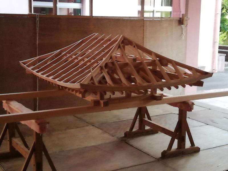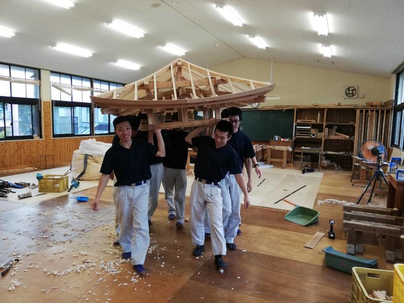 伝統建築専攻科2年生で今年度1月に完成予定の芦北町告地区の山の神社の1/2模型です。これを、9月28日(土)体育大会で初めて参加する部活動紹介の行進で、神輿として担いで参加することになりました。