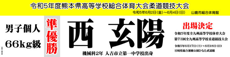 男子個人66kg級の西玄陽選手(2年機械科、人吉一中出身)が準優勝で全九州高等学校柔道競技大会出場権を獲得、男子個人90kg級の北川良唯選手(2年機械科、人吉三中出身)、男子個人100kg級の橋口朋弥選手(3年電気科、あさぎり中出身)、男子個人100kg超級の青木蓮樹選手(2年機械科、人吉二中出身)の3名がベスト8となりました。