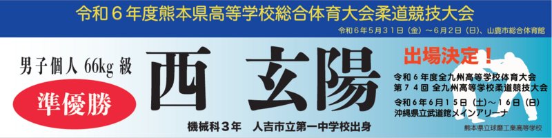 66kg級で3年機械科の西玄陽選手(人吉一中出身)が準優勝となり、6月15日〜16日に沖縄県立武道館で行われる九州総体出場権を獲得しました。