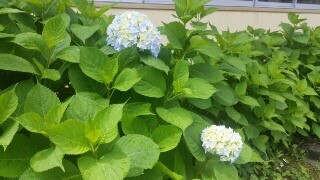 中庭のあじさいの花が二輪咲いています。なぜ紫陽花と書いてアジサイと読むのか知りません。でも、この淡い紫色を見ていると夢見心地の気分にひたれます。