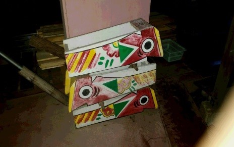 ② 建築科の実習工場の前にキジ馬が3騎積み上げてありました(右写真)。フラワーポットとして生徒が作った作品だそうです。言うまでもなく、キジ馬は平家の落人たちが都での華やかな生活を思い返しながら作る手慰めとして作り出した民芸品だと言われています。