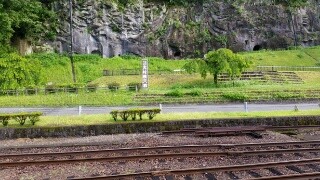 *  大村横穴古墳群(Omura side hole tomb)は、JR人吉駅の北側にあり、岩の崖には27の横穴が掘られています。1400年ほど前の古墳時代後期の墓だと言われています。左の写真のように、人吉駅のホームからぽっかり口を開いている穴が見えます。何も知らなければきっと「あれはなぁに?」と思うはずです。古代人が闊歩していたことを彷彿させる場所のすぐ隣に停車場がある光景は日本広しといえどもあまりないかもしれません?