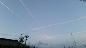 飛行機雲はジェットエンジンからの排気ガスが核になり、水蒸気が凝結して生じるもので、上空の環境によってできる時とできない時があります。どんな時にできるのか調べてみて驚きました。飛行機雲が現れすぐ消えずに長時間残る時は、空気中の水蒸気が多いことを示し、何と、天気が下り坂の前兆なんだそうです。そういうこともつゆ知らず、この歳までポカンと眺めていたとは・・・!?