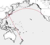 ということで、私、飛行機を見つけると、いつもこのアプリを開いて検索してしまいます。あくまでも私が人吉の空を見上げて確認した飛行機を調べた限りの話になりますが、本市上空を飛ぶ国際線には以下の便がいました。(そのアプリの画像を貼り付けて皆さんにお見せすることができればいいのですが、著作権上その行為が許可されているのかどうか不明ですから、フリーの白地図にいくつかの路線のイメージを書き込んだものを代わりに載せておきます)