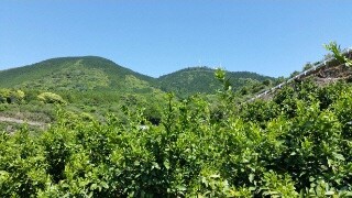 山麓に広がるみかん園は白い花が満開。目を下に落とすと、道沿いにはヨモギがびっしり生えていています。顔を近づけて、「これこそ野原の匂い!」と、その香りを楽しんでいたら、223段後半に「蓬の車に押しひしがれたりけるが、輪まはりたるに、近ううちかかりあるもをかし」2と続いていたことも思い出しました。多分、牛車の中にはヨモギの香りが漂っていたんだろうな・・・と。