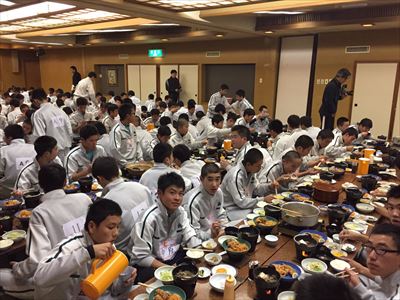 修学旅行1日目の夕食です。生徒たちにとって、楽しみにしていた食事です。食欲旺盛で、御飯も何杯もおかわりをしてました。夕食、美味しかったです‼︎