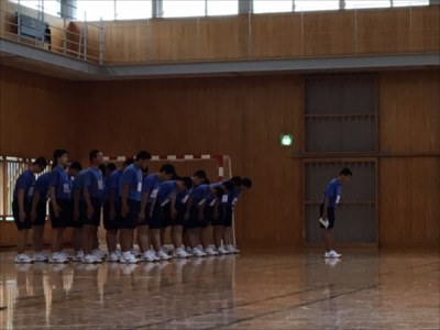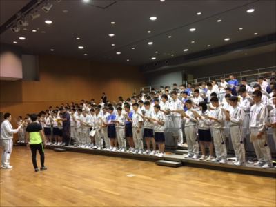 1日目午後は、集団行動の研修を行いました。最初は、保健体育科迫先生の指揮のもと、全体で一連の流れを通した練習を行いました。最初は行動がおぼつかないところもありましたが、徐々に機敏な行動ができるようになりました。