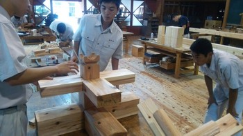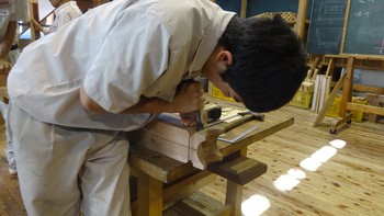 修復班が行っている水上村白水阿蘇神社神楽殿高欄修理は原寸大の模型の製作が終わり、本格的に制作に入っています。練習とは違い間違いや失敗が許されないこともあって緊張感を持って取り組んでいます。