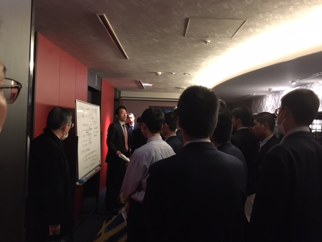 ホテルで帰着のチェック後、ホワイトボードで今夜から明朝までの日程を確認。