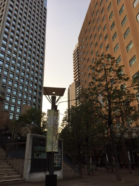 ホテル周辺のビル街。左側が5時ごろ、右側が7時ごろの画像です。