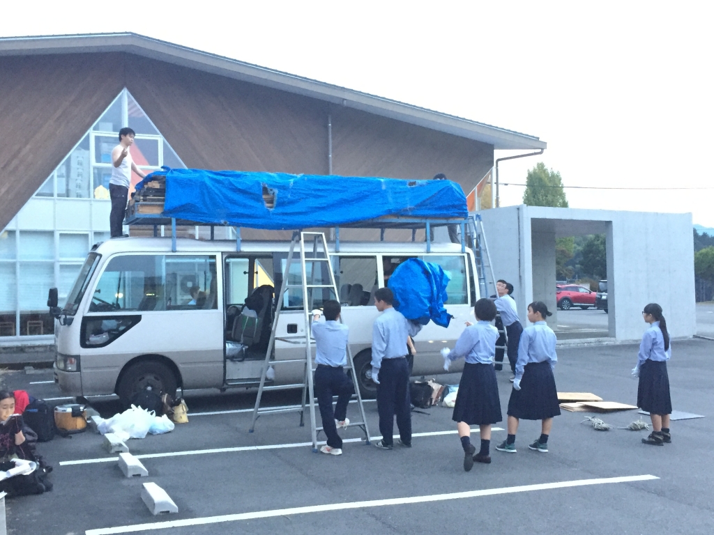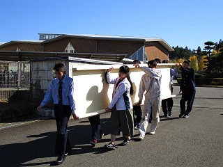 芸術鑑賞終了後は、バスケットボール部・卓球部・剣道部・バレーボール部を中心として劇団アルファー様の片づけ・搬出・積込み作業を手伝いました。