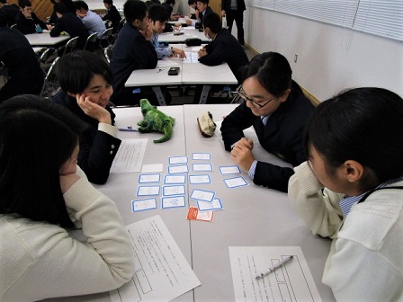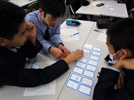 カードを使って話し合いをしています。楽しげな意見が出ています。