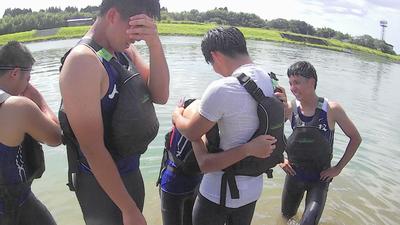 下共に練習を頑張ってきた人高のフォアのメンバーを抱き合う様子