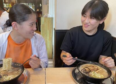 昼食の美味いラーメンに舌鼓ニヒヒ なんで見合ってる?笑