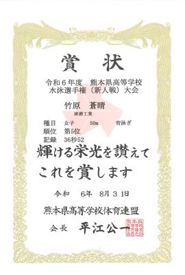 写真は今大会で入賞した1C竹原蒼晴の賞状です。
